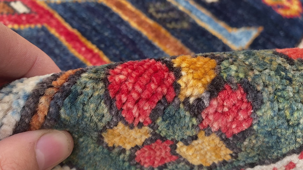 Design: Features bold tribal and geometric motifs in multi colors, framed with classic Caucasian borders.
