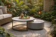 Serene tables add a clean, modern touch to any space. The slim side table features an angled metal base and a marble-style top, while the nesting set pairs a sleek metal frame with a soft upholstered base. Use them together or separately for flexible, stylish functionality indoors or outdoors..