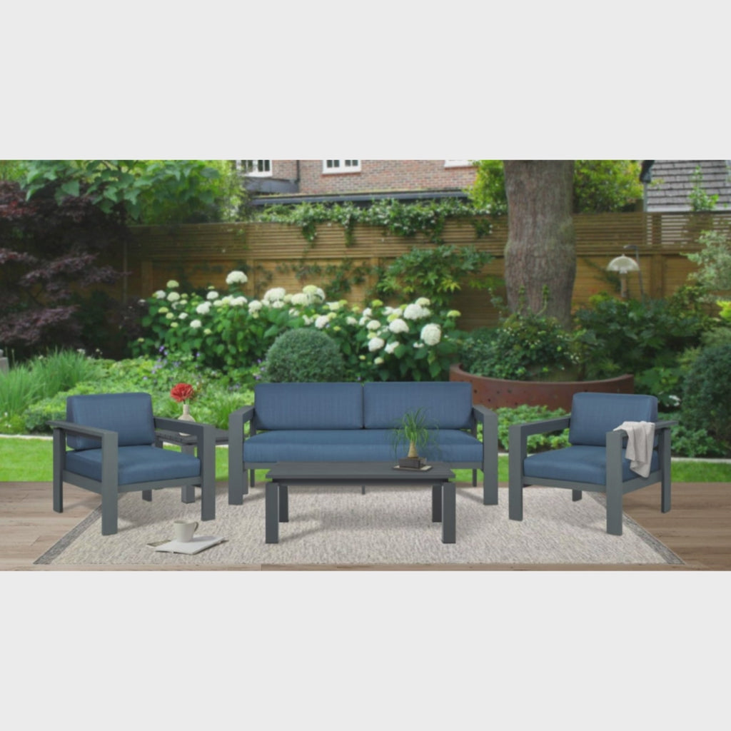 The Sardinia collection has a fresh modern feel. This will be the only outdoor furniture we will need, as it is made with resistance to the outside weather conditions. Very durable and designed for comfort. Metal frame and fabric blue cushions. Enjoy your summer days and nights with these beautiful pieces.