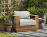 Here is a fresh new look at your outdoor furniture with the Paradiso collection. Entertain your friends and family out on your deck this summer. Made of Teak wood native of Southeast Asia. The most durable garden furniture you can own. It will withstand extreme weather conditions. The Arm Chair is designed beautifully with straight lines and fabric tick cushions to add to your comfort.