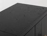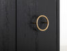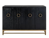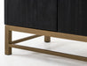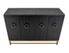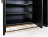 Elevate your space with the sophisticated Merinzo Console, crafted from mixed woods with a translucent black finish. A natural stone top adds luxurious texture, beautifully contrasted by a sturdy metal base. Mortise-and-tenon construction ensures durability, while magnetic-catch doors and fixed shelves offer practical storage. Finished with gold metal handles, this console delivers a bold modern deco look.