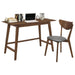 Bring mid-century charm to your workspace with the Orrenza 2-Piece Desk and Chair Set. Featuring a walnut finish, tapered solid wood legs, and a grey leatherette seat, this compact set combines style, comfort, and functionality—perfect for small spaces or home offices.