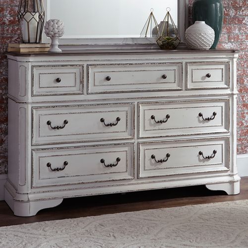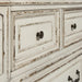 Add timeless elegance to your bedroom with the Allyson Park White Bedroom Set. Crafted from rubberwood solids with white oak and birch veneers, this collection features an antique white finish with weathered brown tops and artistic distressing. The bed showcases a tufted chenille headboard in soft neutral tones, with arched crowning and dog bone accents for added charm.