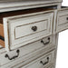 The dresser, chest, and nightstand offer smooth full-extension drawers, felt-lined top drawers, and dust-proofed bottoms—all accented by antique pewter hardware. A built-in charging station on the nightstand includes two USB ports and two outlets for modern convenience.