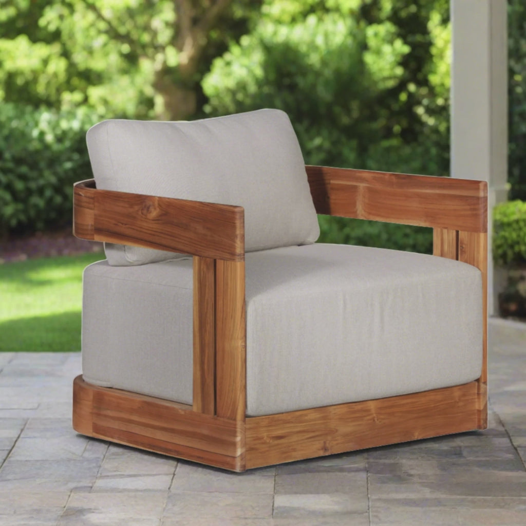Here is a fresh new look at your outdoor furniture with the Paradiso collection. Entertain your friends and family out on your deck this summer. Made of Teak wood native of Southeast Asia. The most durable garden furniture you can own. It will withstand extreme weather conditions. The swivel chair is designed beautifully with straight lines and fabric white tick cushions to add to your comfort.
