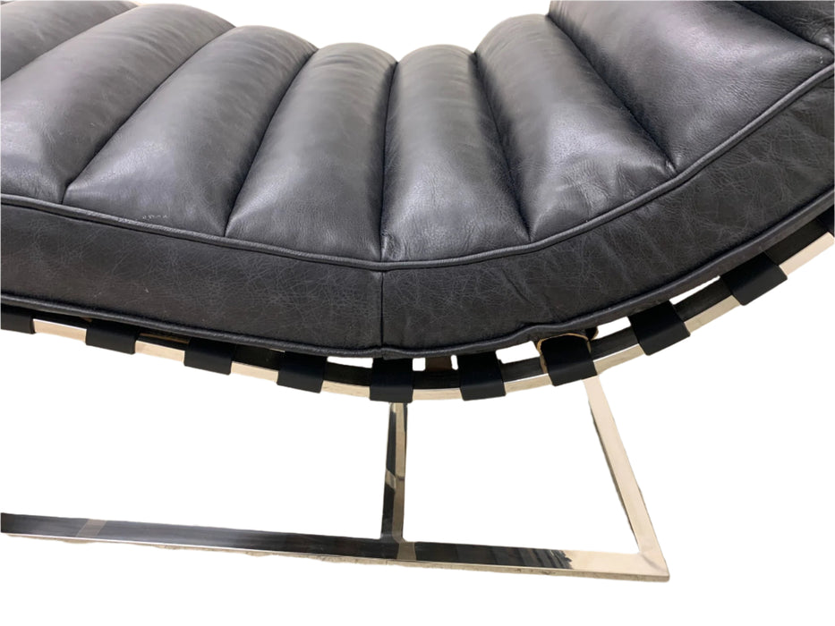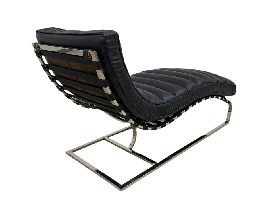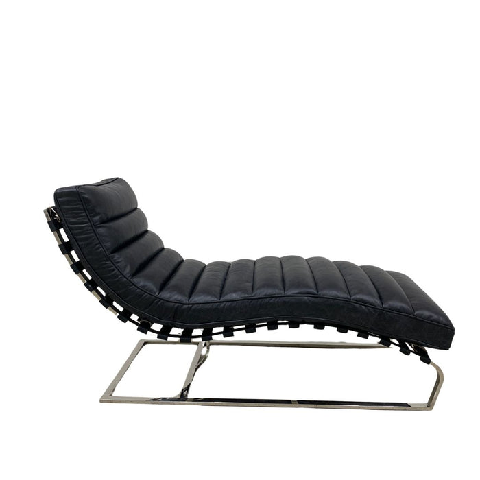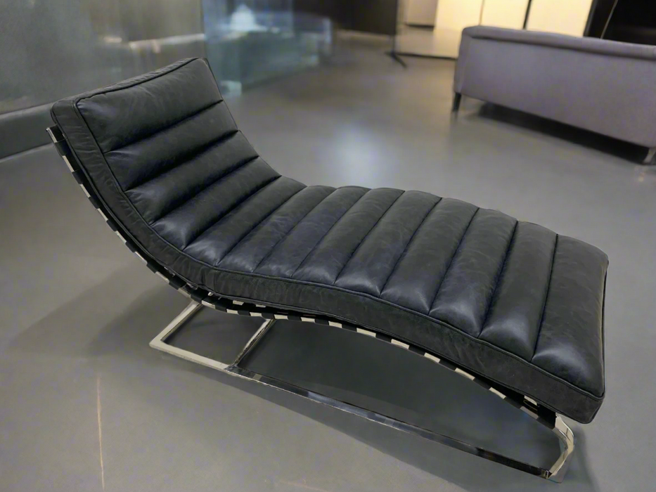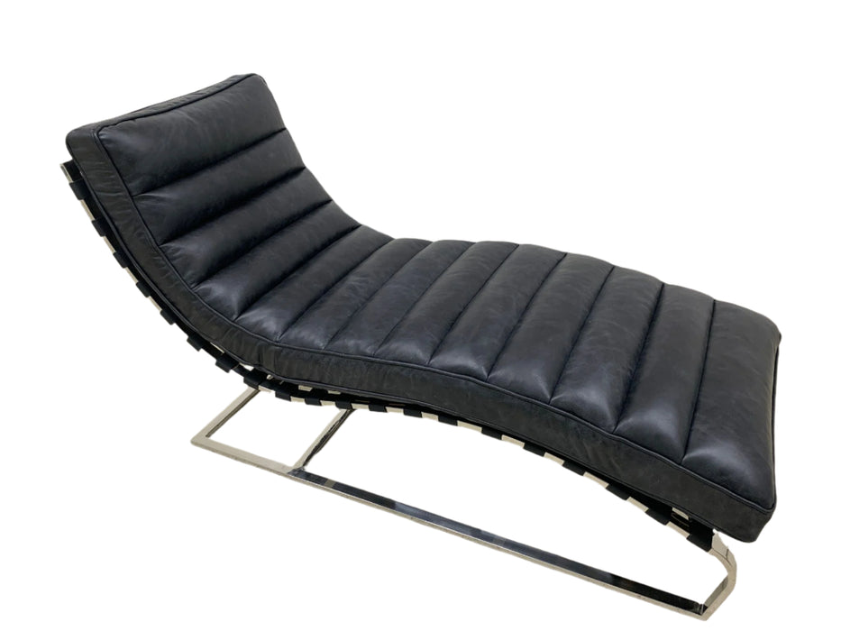 The Plano Chaise Lounge will complete your modern home and collection. This classic design has an elegant curved base and channeled leather body.